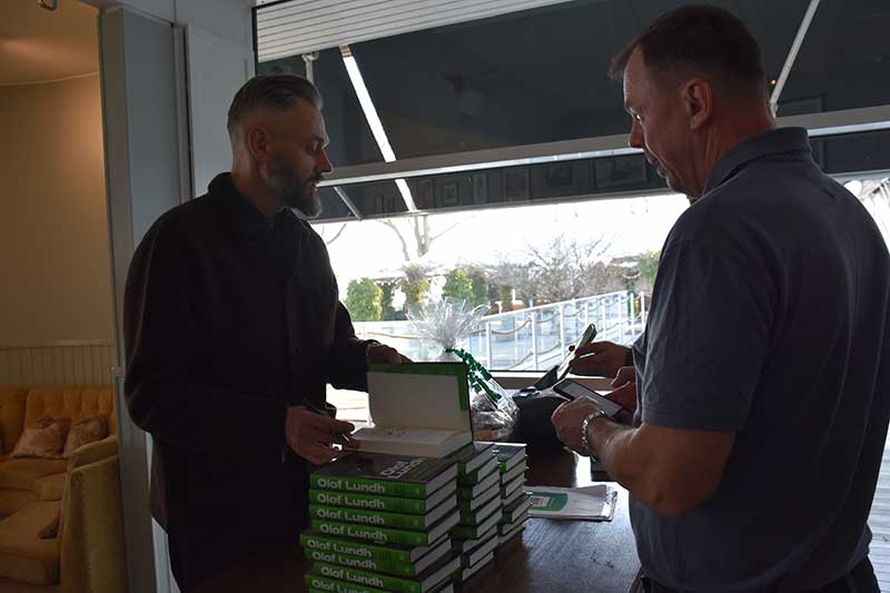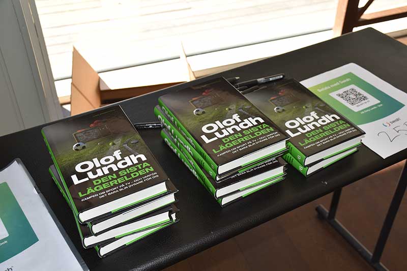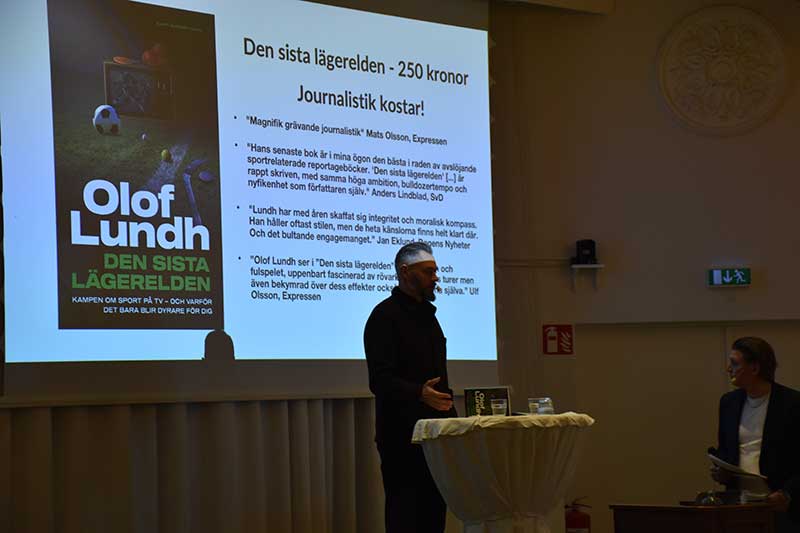 I den efterföljande frågestunden tacklade Olof med briljans och skärpa frågor om journalistikens framtid, sin egen vinnarskalle, Sveriges chanser i det stundande playoff-mötet med Ukraina och hur han känner inför sommarens VM i Nordamerika och alla de ekonomiska och politiska utmaningar som radar upp sig inför detta mästerskap. Den under senare decennier formligen exploderande tevemarknaden för sport i allmänhet och fotboll i synnerhet och de negativa konsekvenserna av denna utveckling, är ett annat ämne som Olof brinner för och sannolikt skulle ha kunnat pratat om hela natten denna fredag. Istället fick de som ville veta mer om Olof Lundhs syn på just detta efteråt köpa hans senaste reportagebok ”Den sista lägerelden”, som handlar om hur Norden blev en av världens hetaste marknader för sporträttigheter.