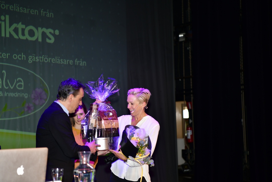 – Tack för en oerhört inspirerande föreläsning, Kajsa! Du uppmanar oss att sätta höga mål och det tänker jag göra nu. Nästa gång du kommer till Ystad ska vi baka världens godaste semla och bjuda dig på, sade Olof Viktors vd Janne Simoes när han överlämnade en presentkorg full av läckra delikatesser till Kajsa.