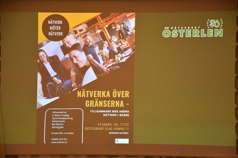 Under vintern har det strömmat in nya medlemmar hos Nätverket Österlen och i vanlig ordning intervjuades de kort på scenen av den alltid lika påläste och proffsige konferencieren Anders Nilsson. Åsa Kryger Wahlin representerade Akka Frakt, Kjell Solander informerade om Lindeshög Medical & Educations verksamhet och Sandra Mårtensson (mamma till den ovan omskrivne stipendiaten Melvin) presenterade Kåseberga Café & Bistro som är ett måste för alla som besöker Österlen. Vi fick också träffa Josefine Ljungberg Palm från Moll Wendén och Mattias Andersson på Printprofil. Under vinjetten 180 sekunder berättade Lars Falk från Radio Active om kanalens exponeringsmodeller inklusive det nya konceptet Företagskampen.