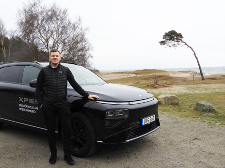 Xpengs elbilar passar bra in i den skånska naturen tycker säljaren Felix Holm och visar upp modell G9 vid den som vanligt blåsiga Östersjön.