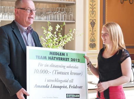 Amanda när det begav sig och hon blev Sverigeetta i sin åldersklass i löpning och dessutom stipendiat i Team Nätverket. På den tiden var årsstipendiet på 10 000 kronor. Lars Hörbo, numera ekonomiansvarig i Nätverket Österlen, överräckte checken